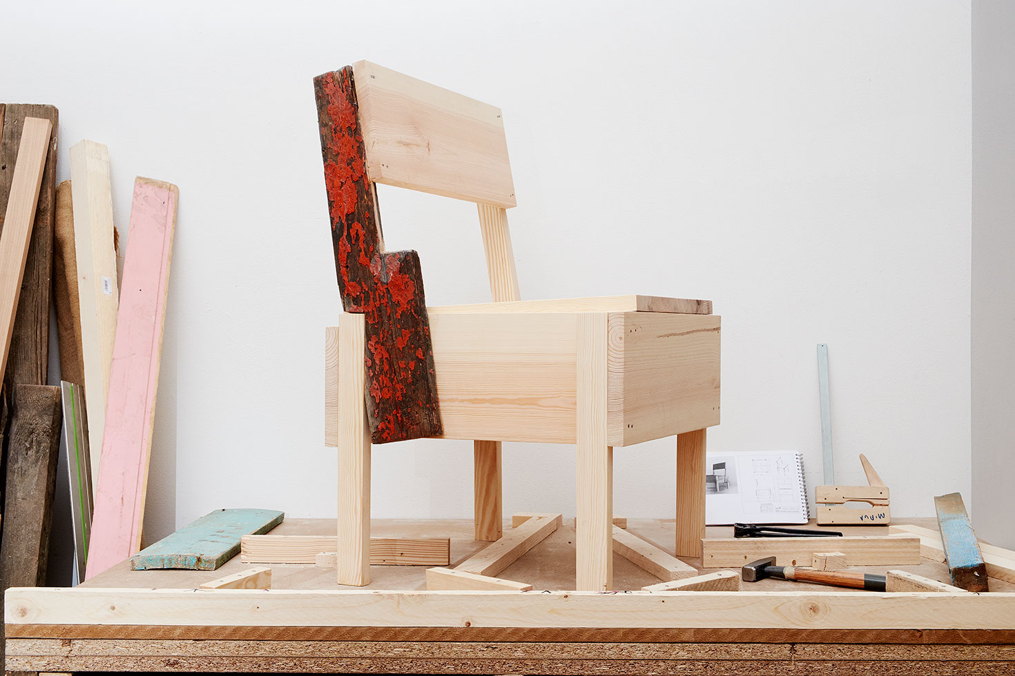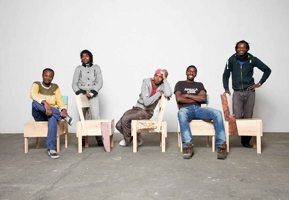 Nello spazio del laboratorio berlinese, un gruppo di rifugiati dell’Africa Occidentale, passati per Lampedusa, impara l’arte di lavorare il legno: affiancati da educatori, artigiani e designer, realizzano i mobili della Proposta di Autoprogettazione che Enzo Mari ha promosso nel 1974.